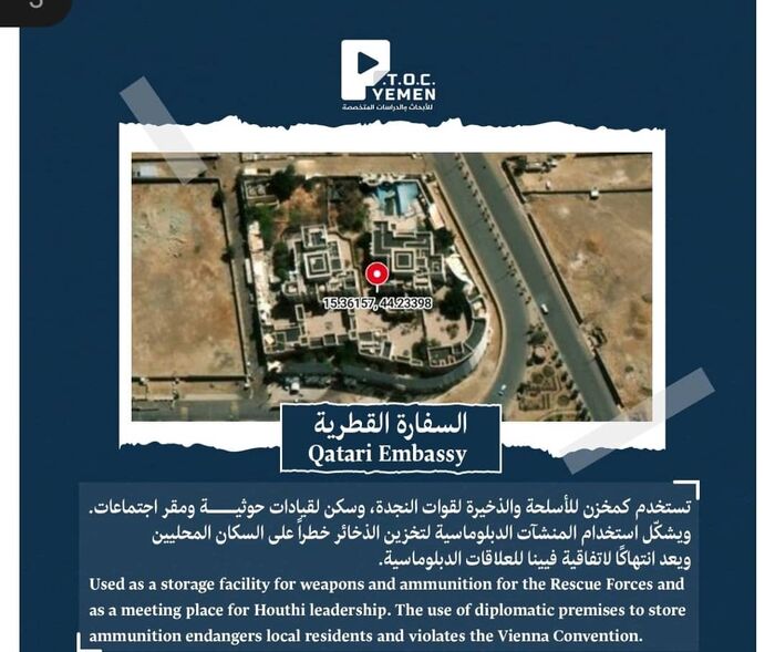 وأوضح التقرير، الذي استند إلى مصادر ميدانية خاصة وصور أقمار صناعية، أن مليشيا الحوثي الإرهابية استغلت حصانة المقرات الدبلوماسية لتخزين الأسلحة والذخائر، وإقامة غرف عمليات، وإيواء قيادات عسكرية وأمنية، وتحويل بعضها إلى ثكنات عسكرية ومراكز استخباراتية.